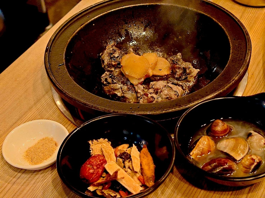 這次吃到最新的全酒「燒酒烏骨雞蛤蜊鍋」和全台首創會點火燃燒的「火焰香辣鍋」。