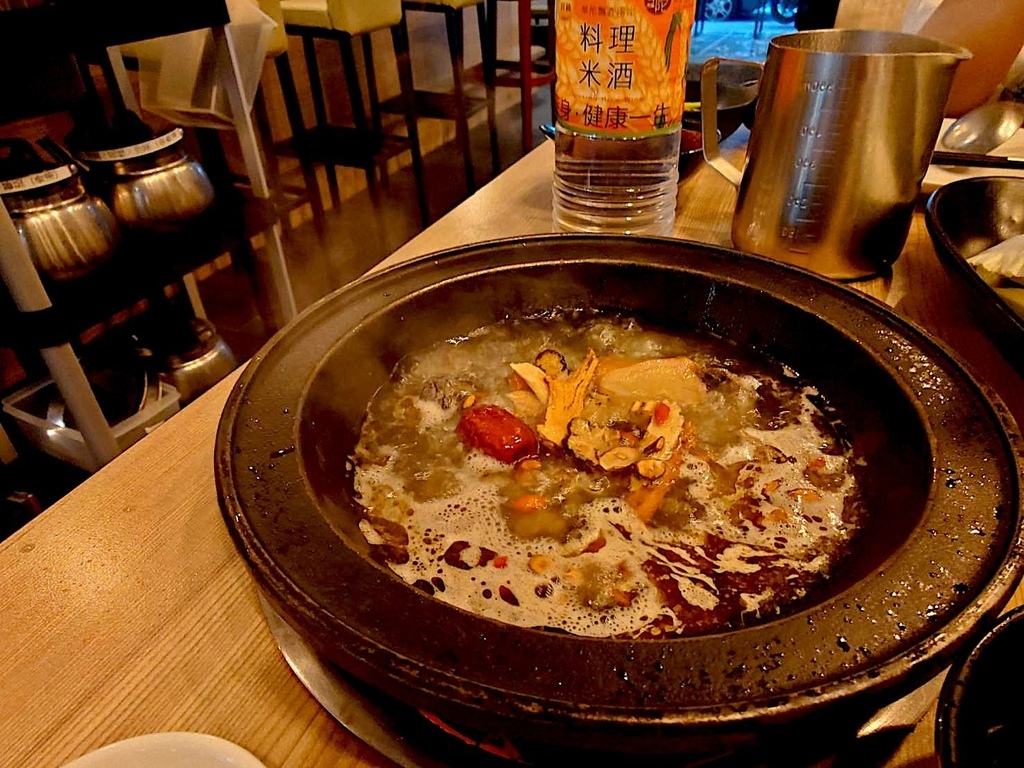 在蛤蜊煮開、煨煮3分鐘左右,還沒加入任何食材前,我就迫不急待想嚐嚐這鍋全酒烏骨雞蛤蜊湯。口味也完全不讓人失望,很甘醇濃郁,沒有開車騎車一定要喝。我還開完笑問店員,未滿18歲可以點這個湯底嗎(XDD