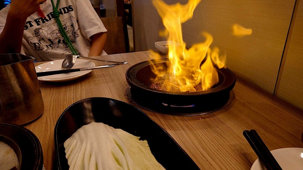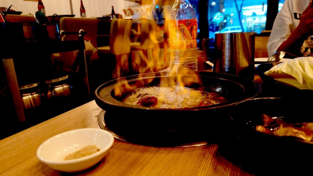 沒錯~有了全酒烏骨雞蛤蜊鍋的燒酒經驗,看我把桌上的物品移超開,要拍限動、拍照就是要躲一些。這火焰大概3秒鐘結束~