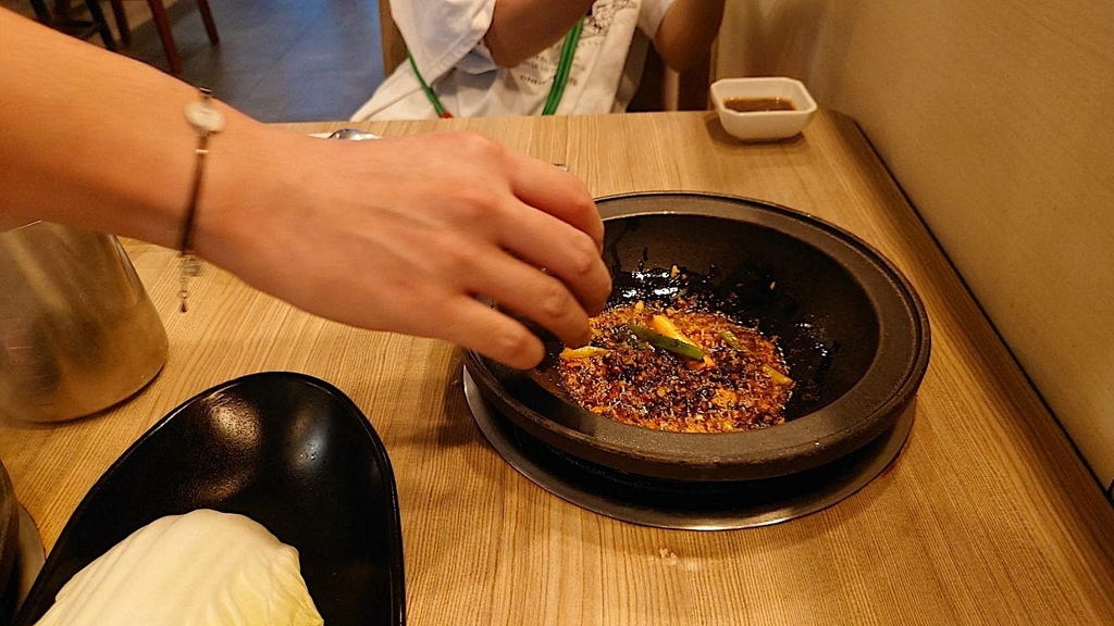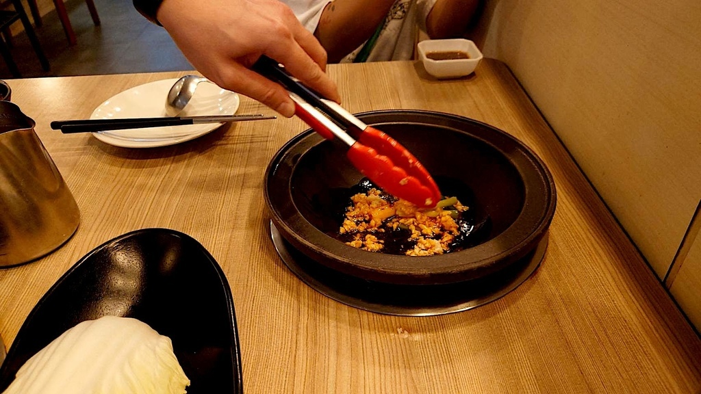 過去只有吃石頭火鍋會有桌邊爆炒食材的程序,狂一鍋的燒酒烏骨雞蛤蜊鍋,也是現炒現煮的湯底。光是湯底的食材就有烏骨雞肉和蛤蜊!下重本啊!